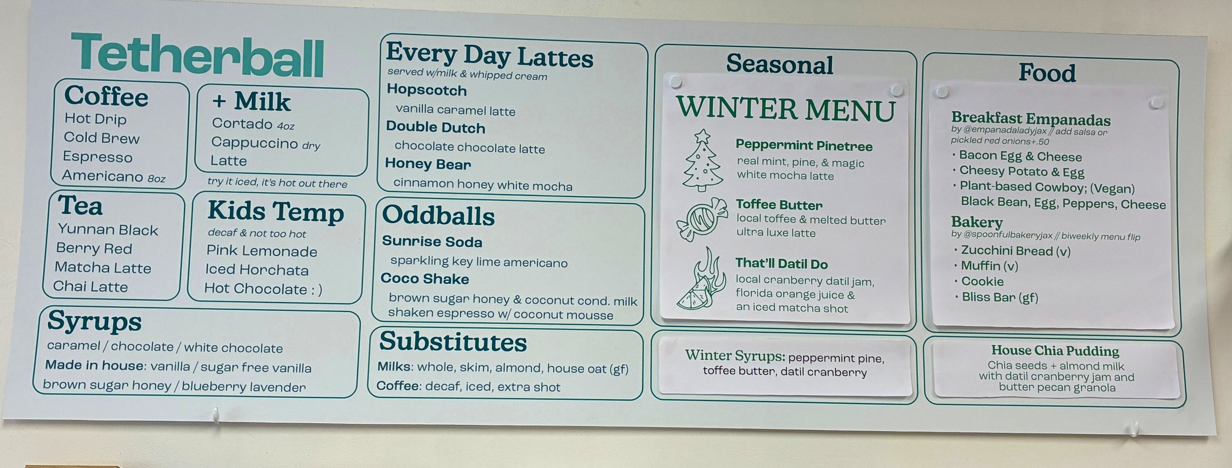 Almost everything can be hot cold or decaf. We’ve got plenty of gluten free and vegan options, we don’t use corn syrup in anything, and make a lot in house like our oat milk. Don’t be afraid to ask if you have questions or want something unique.
